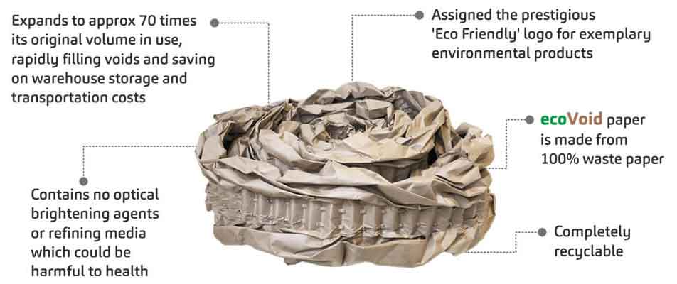 • ecoVoid paper expands to 70 times its original volume, cutting down on storage space and costs.